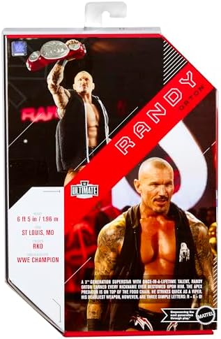 The Viper strikes first and shows no mercy with Randy Orton in Mattel WWE Ultimate Edition Series 18! The Legend Killer’s legendary career is finally immortalized with a next-level Ultimate Edition figure, and Orton arrives with three alternate head scans featuring accurate facial hair and a full range of intense expressions. The Master of the RKO comes wearing black trunks, black kneepads, black wrist and hand tape, and black laced boots. His accessories include a black fabric sleeveless hoodie with “RK-Bro” logo on the front, as well as three sets of hands to replicate his iconic poses!Randy Orton – WWE Ultimate Edition 18 Ringside Toy Wrestling Action Figure by Mattel!Take your WWE collection to the next level with this WWE Ultimate Edition action figure featuring authentic ring gear and entrance attire. This Ultimate figure also includes over 30 points of articulation plus ab-crunch torso, double-jointed knees, and double-jointed elbows for authentic poses, incredible signature moves and the ultimate pose-and-play action! Figure also includes swappable parts, including heads, arms, hands, and attire to recreate and relive even more favorite WWE Superstar moments. Fans will love the Ultimate figure’s versatility and play action that they can stage again and again in all-different ways.Â