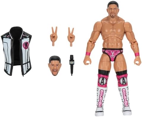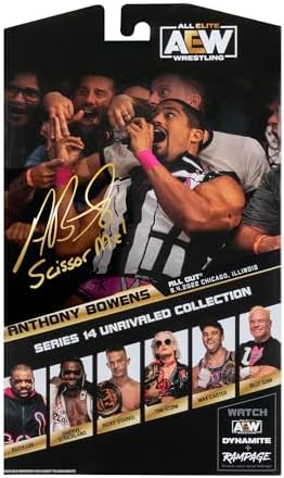 Join the scissor party with Anthony Bowens in Jazwares AEW Unrivaled 14! Bowens brings energy to the line with two unique head sculpts, featuring determined and tongue-out expressions. He comes wearing pink trunks with black-and-white scissor designs and “Bowens” rear logo, as well as Acclaimed logo kickpad-style boots and knee pads. His look is complete with a black-and-white “Everyone Loves the Acclaimed” scissor logo entrance vest, and he has an interchangeable set of scissor hands for accurate posing!Anthony Bowens – AEW Unrivaled 14 Toy Wrestling Action Figure by Jazwares!Everybody Loves The Acclaimed!