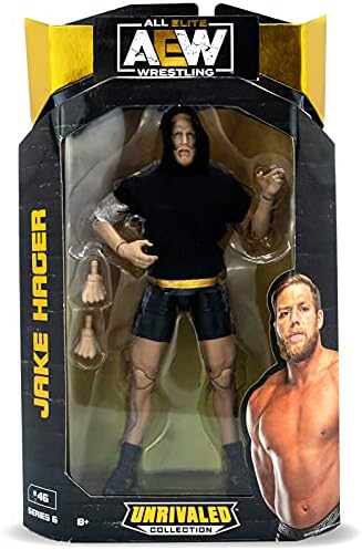 Hit hard and make them feel it with Jake Hager in AEW Unrivaled 6 from Jazwares! Hager has a bearded head sculpt and a removable, cloth black jacket with gold trim. He’s also wearing black short tights with yellow trim and green and black ring shoes. The figure also includes a pair of interchangeable hands!Jake Hager – AEW Unrivaled 6 Toy Wrestling Action Figure by Jazwares!